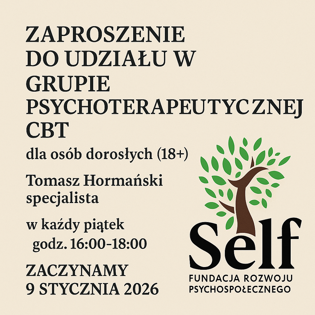 dla osób dorosłych (18+) Fundacja Rozwoju Psychospołecznego SELF serdecznie zaprasza do udziału w grupie psychoterapeutycznej w nurcie poznawczo-behawioralnym (CBT). To bezpieczna, wspierająca przestrzeń, w której uczestnicy pracują nad emocjami, myślami, nawykami i trudnościami dnia codziennego — krok po kroku ucząc się skutecznych strategii radzenia sobie. Prowadzący: Tomasz Homański – specjalista, psychoterapeuta pracujący w nurcie CBT z osobami dorosłymi. Start grupy: 📅 9 stycznia 2026 r. 🕓 Piątki, godz. 16:00–18:00 Dla kogo? osób dorosłych od 18 r.ż., ( po odbyciu...