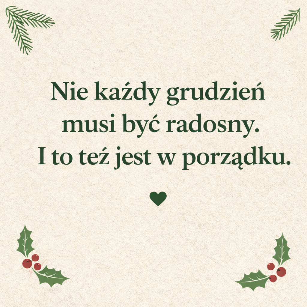 Nie każdy grudzień jest radosny. I to nie odbiera Ci prawa do świąt.** Grudzień często niesie ze sobą szczególne oczekiwania.Ma być ciepło, blisko, rodzinnie.Ma być „jak w reklamach”. Tymczasem dla wielu osób ten czas jest jednym z trudniejszych w roku. Bo: ktoś kogoś stracił, ktoś jest w konflikcie z rodziną, ktoś jest przemęczony, ktoś przeżywa kryzys, ktoś po prostu nie ma zasobów na radość. I to wszystko mieści się w byciu człowiekiem. 💚 1. Presja „świątecznej...